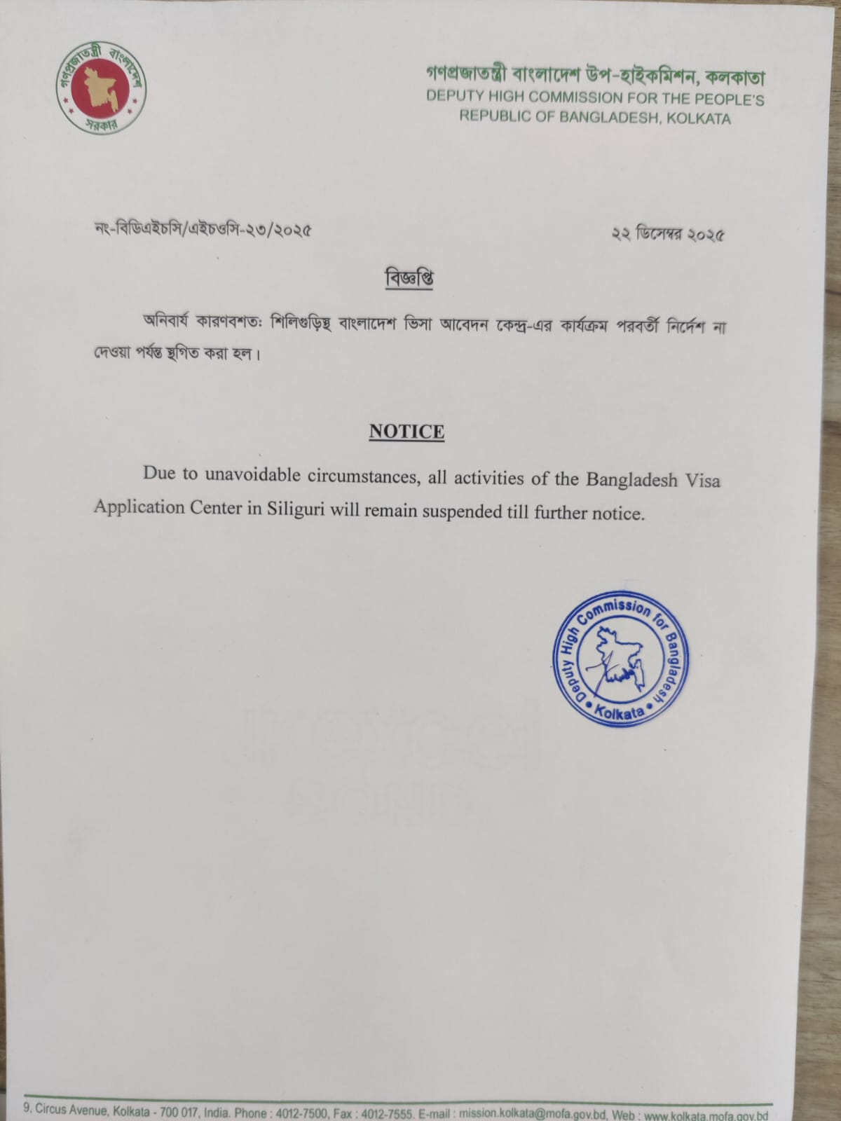 অনিবার্য কারণবশত শিলিগুড়িস্থ বাংলাদেশ ভিসা আবেদন কেন্দ্রের কার্যক্রম সাময়িকভাবে স্থগিত করা হল।
